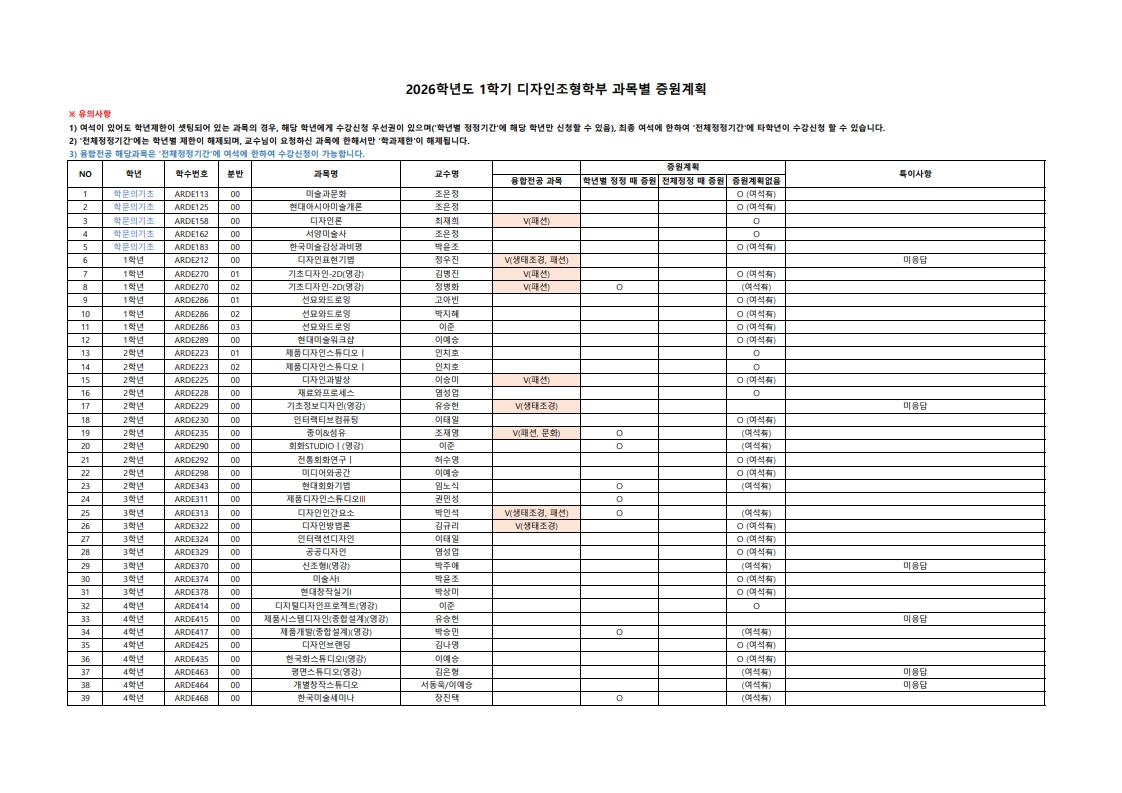 * 수강신청 정정기간동안 반드시 학생 본인이 직접 수강신청시스템에 접속하여 여석에 한하여 수강신청 정정을 진행해야 합니다. 행정실 또는 교수님께 말씀드렸다고 하여 자동으로 수강신청이 완료되는 것이 아니니 꼭 유념하시기 바랍니다.